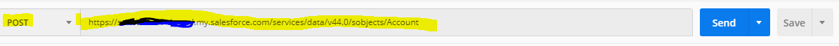 Create a new tab -> Set a POST service -> Set the following url: https://OUR_ORG_NAME.my.salesforce.com/services/data/v44.0/sobjects/Account